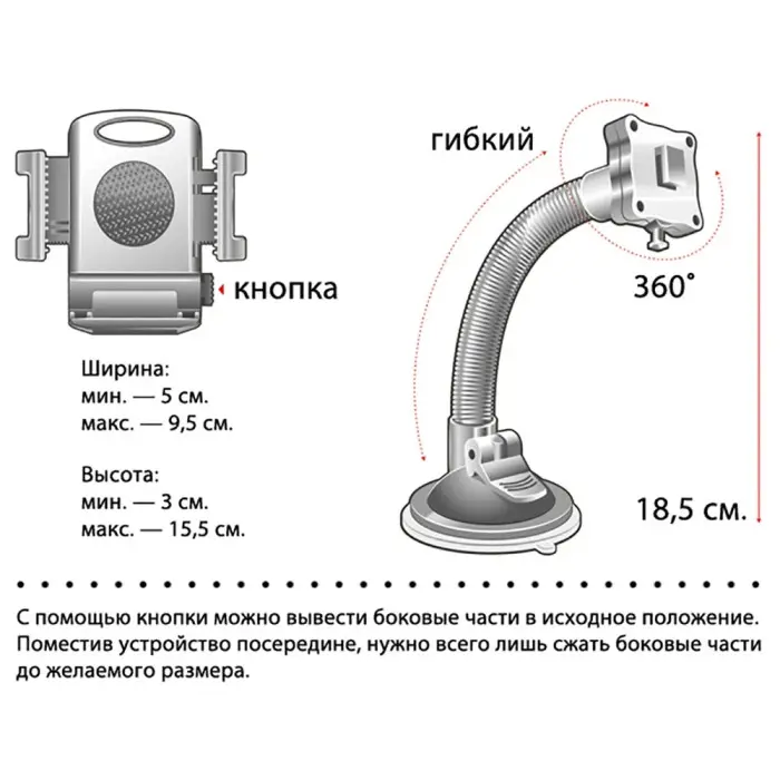 Оснащен мощной вакуумной присоской, держатель прочно фиксируется на лобовом стекле или приборной панели, обеспечивая стабильность даже на неровных дорогах.