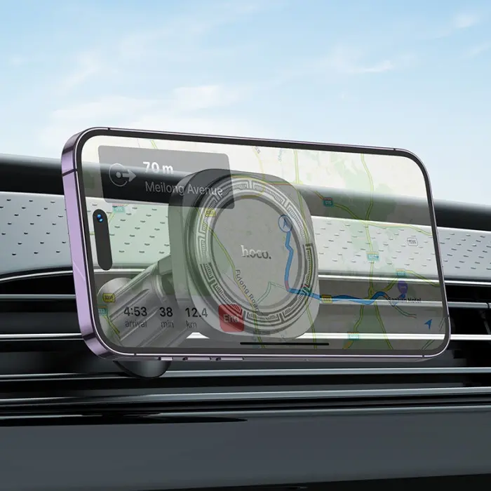Телефон находится на уровне глаз водителя, что упрощает использование навигации, музыки или звонков без больших наклонов или отвлечения от дороги. Магнитная система позволяет снять устройство одной рукой — удобно при коротких остановках или смене режима использования.