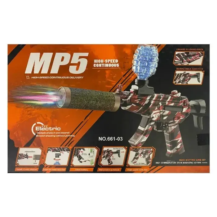 Представляємо MP5 на гідрогелевих кульках (орбізах) у яскравому червоному камуфляжі — стильний і динамічний гел-бластер для активного проведення часу. Ця електрична іграшка поєднує реалістичну форму класичного MP5, автоматичну стрільбу та екологічно чисті гідрогелеві снаряди.