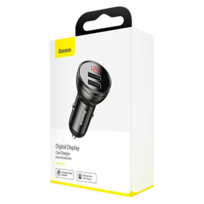 Универсальный автомобильный адаптер Baseus Digital Display для быстрой и качественной зарядки смартфонов. Контроль напряжения осуществляется за счет интегральной микросхемы, для предохранения Вашего гаджета. Сила тока составляет 2,4 А. Может применятся в легковых и грузовых автомобилях на 12 и 24 V бортового напряжения. Контролировать показатели напряжения поможет небольшой дисплей, расположенный в торце. Устройство имеет компактные размеры, его корпус изготовлен из прочного металла, также, имеются элементы из высококачественного пластика. Модель оснащена двумя универсальными портами USB.