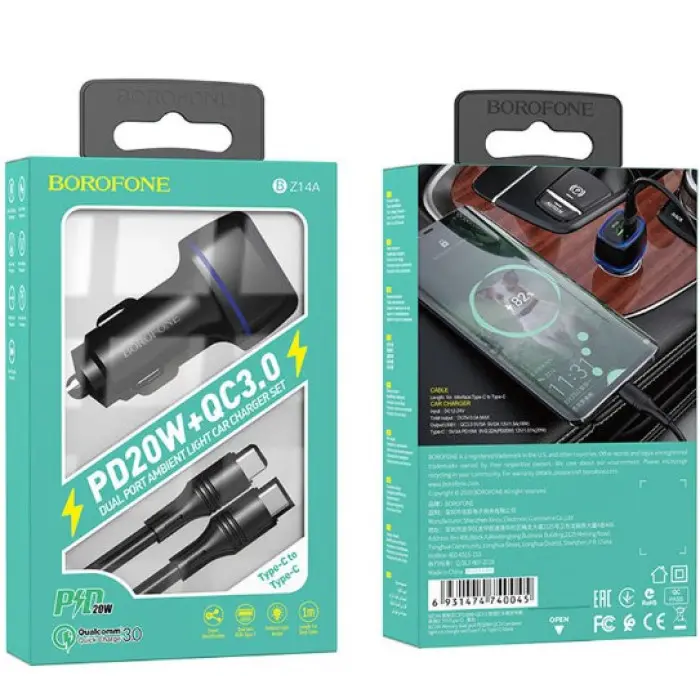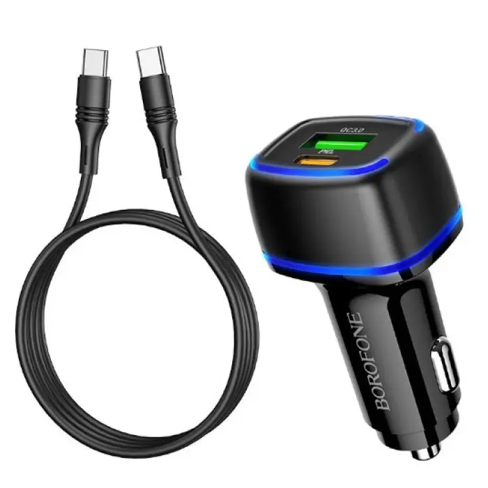 Автомобильное зарядное устройство Borofone BZ14 1USB-A+1USB-C 20W+Q.C3.0 + Кабель Type-C to Type-C Black, Чёрный