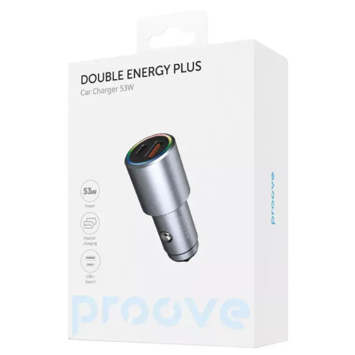 Proove Double Energy Plus – компактное и функциональное автомобильное зарядное устройство для ваших гаджетов. Он поддерживает все известные протоколы быстрой зарядки, такие как PD 3.0 и MTK PE+, что позволяет быстро и удобно заряжать любое устройство. Оба разъема поддерживают быструю зарядку даже при одновременном использовании.