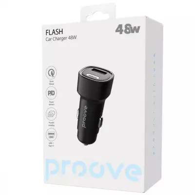 Автомобильное зарядное устройство Proove Flash (USB+Type-C) 48W Black, Черный