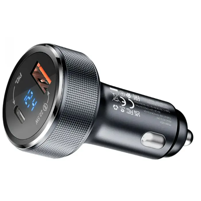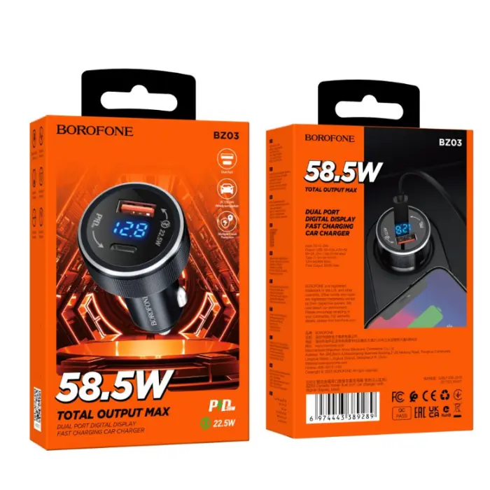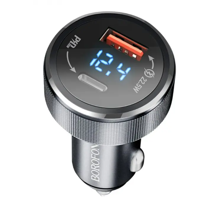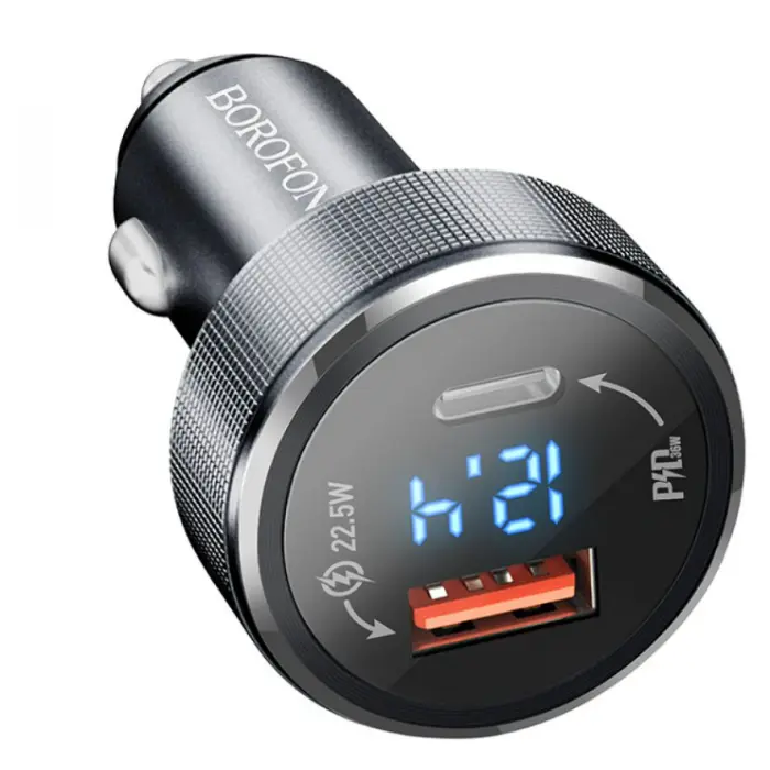 Автомобільний зарядний пристрій Borofone BZ03 Dynasty - це потужний, високотехнологічний адаптер, який виділяється повноцінною підтримкою швидкої зарядки відразу двох гаджетів, сумісних з протоколами QC3.0, PD, FCP і SCP. Модель привертає увагу стильним дизайном та надійною збіркою, виготовлена з використанням матеріалів та електронних компонентів найвищої якості. Корпус аксесуара реалізований із міцної комбінації металу та пластику. Його нижня частина з металевими бічними та нижнім контактами повністю відповідає гнізду прикурювача та гарантує стабільну подачу живлення. Потовщена верхня частина адаптера декорована оригінальним рельєфним візерунком, який запобігатиме ковзанню пальців при вилученні з гнізда. На його круглій верхній панелі знаходяться роз'єм USB, Type-C і LED дисплей, на якому відображається напруга. Максимальна потужність на виході роз'єму Type-C становить 36Вт, сила струму – 3А при напрузі 5, 9 та 12В. Потужність на виході роз'єму USB може досягати 22.5Вт. Сила струму з його виході: 4.5A при напрузі 5В, 5А при 4.5В, 2А при 9В і 1.5 при 12В. Загальна максимальна потужність на виході рознімань становить 58.5Вт. Адаптер може використовуватися у позашляховиках, вантажних та легкових авто з бортовою напругою 12-24В.