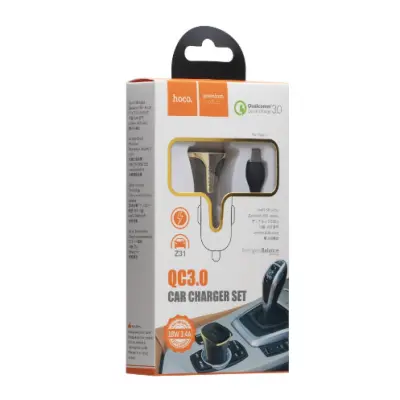 Автомобільний зарядний пристрій Hoco Z31 QC3.0 Type-C 18w 3.4A забезпечує швидкий та стабільний заряд. Контроль напруги здійснюється за рахунок інтегральної мікросхеми для запобігання вашого гаджета. Аксесуар підтримує технологію Quick Charge 3.0, таким чином забезпечує високу швидкість заряджання. Сила струму становить 3,4 A, потужність – 18 W. Модель реалізована в оригінальному дизайні зі стильними золотистими елементами, що відображають його елегантний вигляд. Корпус пристрою виготовлений із високоякісного пластику та має досить компактні розміри. Аксесуар оснащений двома універсальними USB портами, сумісними з будь-яким кабелем і дозволяють заряджати будь-який пристрій. В комплект входить надійний кабель type-c, довжина якого дорівнює 1 м.