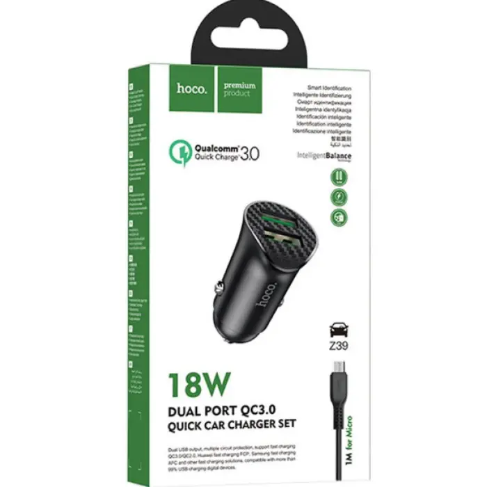 Компактний автомобільний зарядний пристрій прикурювач Hoco Z39. Пристрій підтримує технологію QC 3.0, що дозволить швидко зарядити ваш смартфон, планшет або будь-який інший мобільний пристрій. Вихідні параметри роз\'єму становлять 5/3.0 А. В комплекті: кабель MicroUSB, довжина 1м.