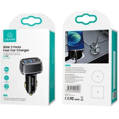 Автомобільний зарядний пристрій Usams C24 2USB+1PD(80W) 5A Black, Чорний