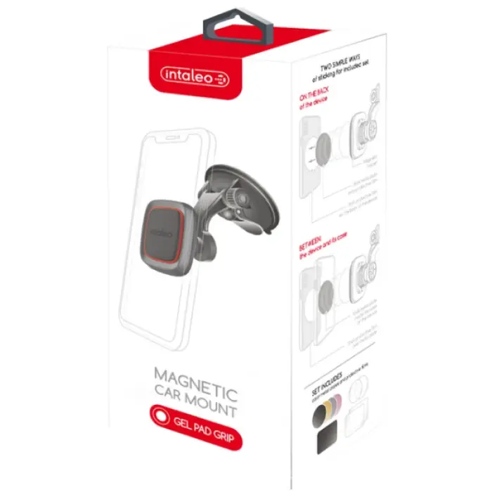 Компактный универсальный автодержатель Intaleo CM01GP со встроенным магнитом, который удобно и безопасно крепится на лобовое стекло.
