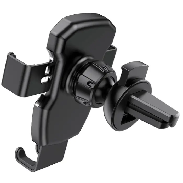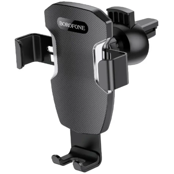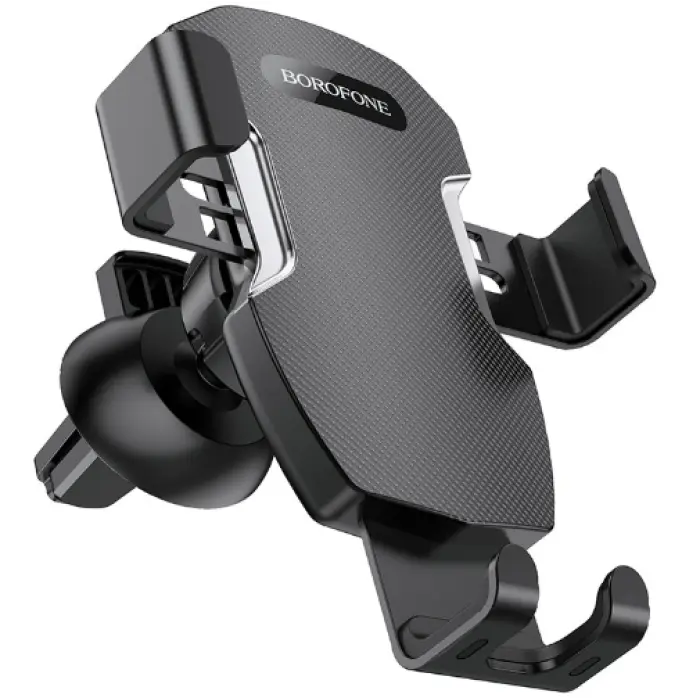 Автотримач Borofone BH55 виділяється надійною конструкцією, ергономічна реалізація якої дозволить встановити смартфон лише однією рукою та повертати його на кут, комфортний для огляду екрану. Завдяки компактним розмірам та стильному дизайну, пристрій лаконічно впишеться в інтер\'єр будь-якого сучасного автомобіля та гармонійно поєднуватиметься з усіма функціональними елементами на його торпедо. Для його виготовлення використовується високоякісний, приємний на дотик пластик і силікон, з якого реалізовані м\'які накладки, що запобігають утворенню потертостей на вентиляційній решітці та корпусі телефону. Центральна накладка аксесуара виконана з оригінальним візерунком та зображенням логотипу виробника, що у поєднанні з матовими та глянсовими деталями надає йому привабливого зовнішнього вигляду. Фіксація смартфона на тримачі проводиться розсувним механізмом з бічними фіксаторами та нижньою підставкою, які оснащені захисними накладками та мають вигнуту форму, що гарантує більш надійне утримання. Модель сумісна з гаджетами шириною 63-89мм та діагоналлю 4.5-6.7 дюймів.