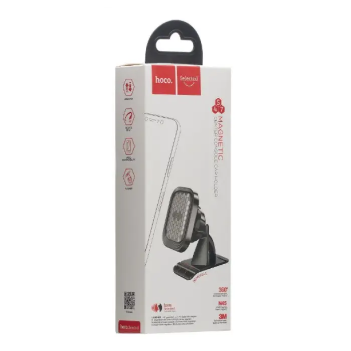 Автотримач Hoco S47 надійно утримує прикріплені пристрої за різного ступеня навантаження. Шарнірне кріплення дозволяє повертати гаджет на кут, комфортний для огляду екрану. Для виготовлення даної моделі використовується ABS пластик та полікарбонат, є елементи із силікону, для запобігання утворенню потертостей та подряпин. Фіксація телефону на тримачі здійснюється за допомогою металевої пластини на звороті задньої кришки телефону або під чохлом. Аксесуар здатний витримувати навантаження до 1 кг, стане чудовим рішенням для гаджетів діагоналлю 4,7 – 6,5 дюймів.