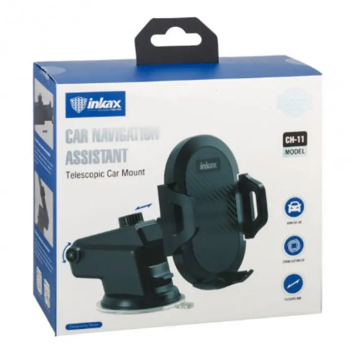 Автотримач Inkax CH-11 – чудовий вибір для комфортного користування телефоном у салоні авто. Практичною конструкцією пристрою передбачена можливість регулювати положення телефону навколо своєї осі завдяки шарнірному кріпленню та регулювати його наближення за допомогою телескопічної штанги. Аксесуар реалізований у сучасному дизайні, виготовлений із високоякісного пластику, який відмінно переносить різного ступеня навантаження. Модель сумісна з гаджетами шириною 45 – 84 мм та максимально проста у використанні. Розсувна система фіксації дозволяє швидко, без особливого клопоту закріпити смартфон за допомогою бічних пластин, при цьому нижня підставка додасть додаткову міцність, не перешкоджаючи доступу до роз'єму для заряджання пристрою. Надійна присоска допоможе закріпити тримач на лобовому склі або торпедо автомобіля.