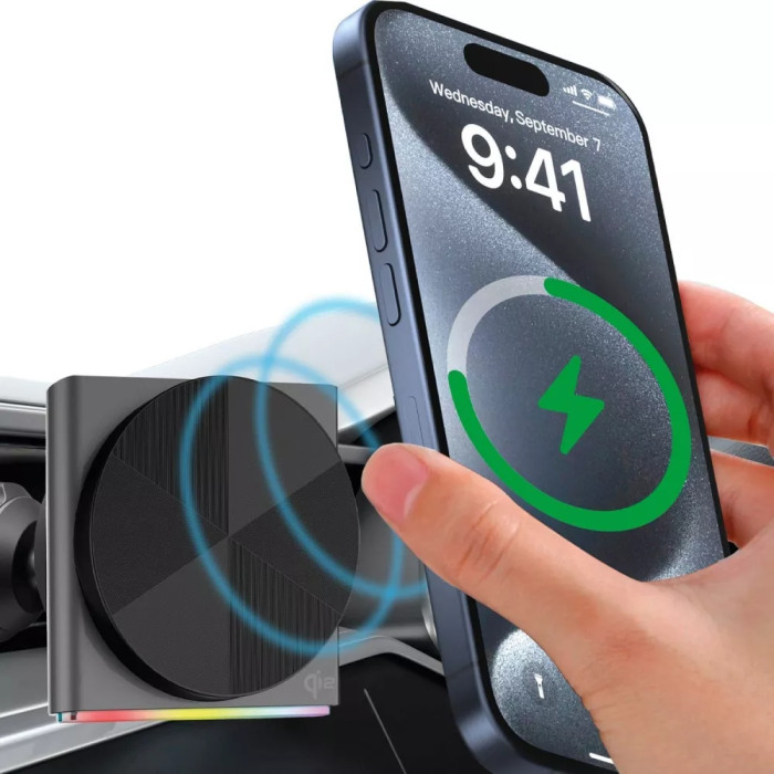 Бездротова зарядка Qi працює на принципі індукційного передавання енергії, через що телефон не потребує фізичного під’єднання кабелем до живлення. Досить розмістити смартфон у тримачі — і зарядка почнеться автоматично. Стандартна потужність 15 Вт є достатньою для сучасних пристроїв, дозволяючи за короткий час поповнити заряд на значний відсоток, що дуже зручно перед стартом довгої поїздки або під час коротких зупинок.