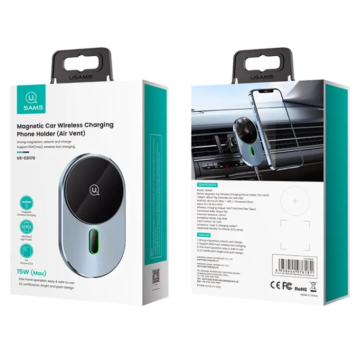 Автомобільний тримач Usams US-CD170 Magnetic Wireless Charger забезпечує надійну фіксацію вашого смартфона, а також дозволяє зарядити сумісні з технологією QI пристрою. Він встановлюється в вентиляційну решітку авто. Кріплення власника в дефлектор здійснюється за допомогою силіконової ніжки-прищіпки. Кріплення ж самого телефону засноване на дії магнітів MagSafe, які знаходяться всередині телефонів серії iPhone 12 або всередині сумісних з технологією MagSafe чохлах. За підтримки стандарту MagSafe, потужність зарядки досягає 15 Вт. Компактний і надійний тримач для смартфонів Usams US-CD170 Magnetic Wireless Charger має преміальний дизайн.