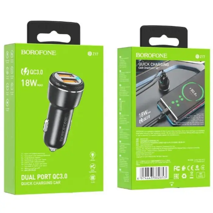 BOROFONE BZ17 Core – автомобильное зарядное устройство с двумя USB портами и поддержкой стандарта быстрой зарядки QC 3.0/PD.