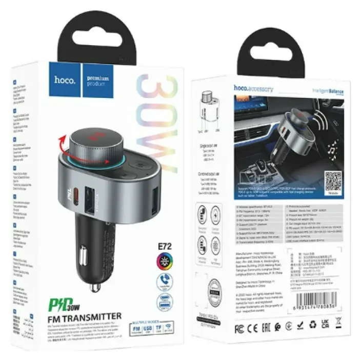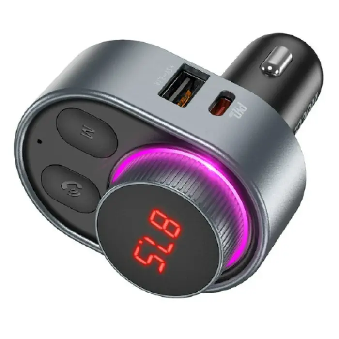 АЗУ з FM-модулятором HOCO E72 PD30W Alegria car BT FM transmitter Metal Gray – це потужний адаптер, оснащений трьома незалежними USB-портами, два з яких з підтримкою протоколу швидкої зарядки PD/Quick Charge 3.0. Модель допоможе з комфортом відтворювати музику зі смартфона та відповідати на дзвінки через акустичну систему автомобіля без будь-яких проводів, завдяки вбудованому Bluetooth V5.0 та мікрофону. Аксесуар виготовлений із якісного пластику, виконаний у стильному дизайні. Модель оснащена зручно розташованою кнопкою для прийому вхідних дзвінків, зручним круглим регулятором для налаштування FM-станцій з різнобарвним підсвічуванням та відображає поточну частоту FM, роз\'ємом Type-C, двома USB-портами та роз\'ємом для TF-карт до 32 Гб. Модель оснащена функцією швидкої зарядки, дозволяє заряджати відразу три гаджети, один із USB-портів підтримує відтворення з флеш-накопичувачів. Загальна потужність струму становить 3,1 А потужність виходу Type-C – 30 Вт. Особливості: − програє музику з мобільного телефону або USB-накопичувача/TF-карти; − встановлена версія Bluetooth 5.0; − заряджає до 3 пристроїв одночасно; − потужність зарядки до 30 Вт; − якісні матеріали забезпечать тривалий термін експлуатації; − має стильне підсвічування; − вбудований захист від короткого замикання, перепадів напруги, перегріву.