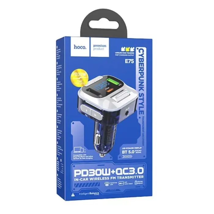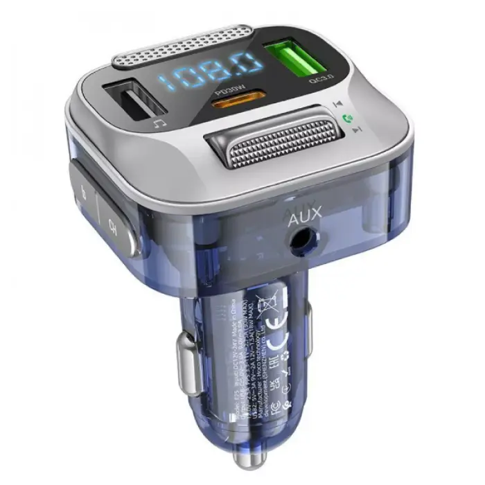 Практичний зарядний пристрій Hoco FM Launcher E75 Bravery PD 30W оснащений усим для максимальної функціональності та комфорту використання. Наявність двох зарядних портів, порту підключення USB-носія для відтворення музичних файлів у форматах MP3/WMA/WAV/FLAC/APE або їх відтворення шляхом з\'єднання з іншими пристроями через Bluetooth і вбудованому приймачу FM-сигналу. Є підтримка одночасної зарядки двох пристроїв, роз\'єм USB оснащений підтримкою протоколу швидкого заряджання QC, а роз\'єм Type-C підтримує протокол швидкого заряджання PD. Hoco FM Launcher E75 Bravery зроблений з преміум ABS-пластику та полікарбонату, що створюють прозорий та витончений зовнішній вигляд. Цей компактний гаджет має зручну центральну кнопку перемикач, яка дозволяє легко перемикатися між функціями, забезпечуючи безпрецедентну функціональність. Завдяки вбудованому LED-дисплею ви завжди будете в курсі поточного режиму роботи та обраної FM-станції.