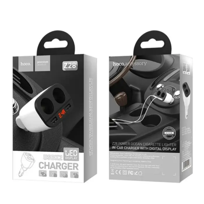 Автомобильный адаптер питания Hoco Z28 – это USB зарядка для мобильных устройств с 2-мя USB портами и 2-мя дополнительными разъемами для прикуривателя.