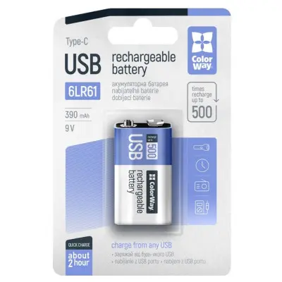 Батарейка ColorWay (Крона) USB-C 390 Мач 9V (LI-Polimer) 1 шт перезаряжаемая
