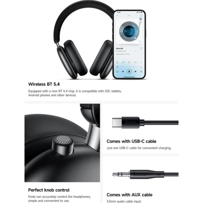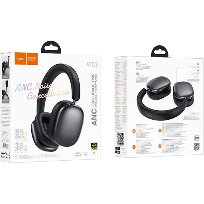 Hoco W63 Black отличаются современным и сдержанным дизайном. Черный цвет корпуса выглядит элегантно и универсально, легко сочетаясь с любыми гаджетами и аксессуарами. Конструкция накладных наушников с закрытым акустическим оформлением создает отличное звуковое пространство и изолирует значительную часть внешних шумов.