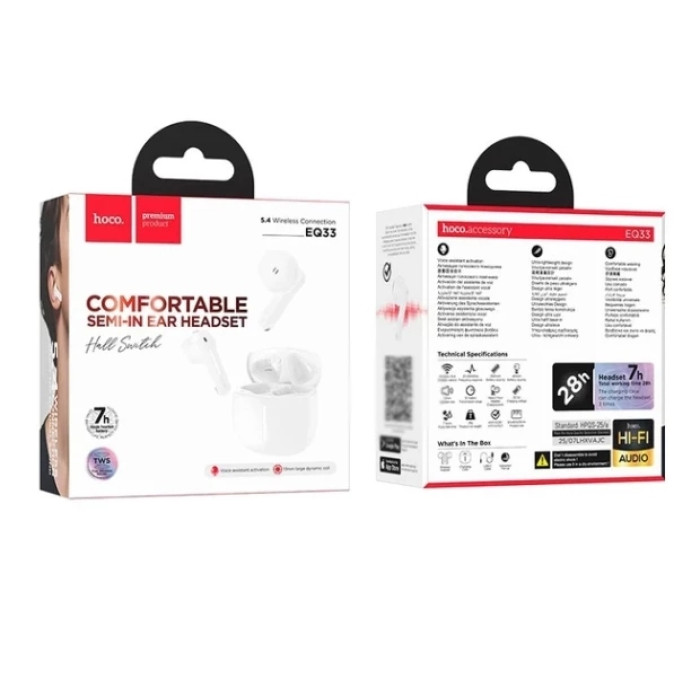 Формат TWS и удобство использования Формат TWS (True Wireless Stereo) в наушниках Hoco EQ33 означает полную автономность каждого вкладыша. Они могут работать как в паре, так и по отдельности, что позволяет использовать один наушник для звонков или навигации, экономя заряд второго.