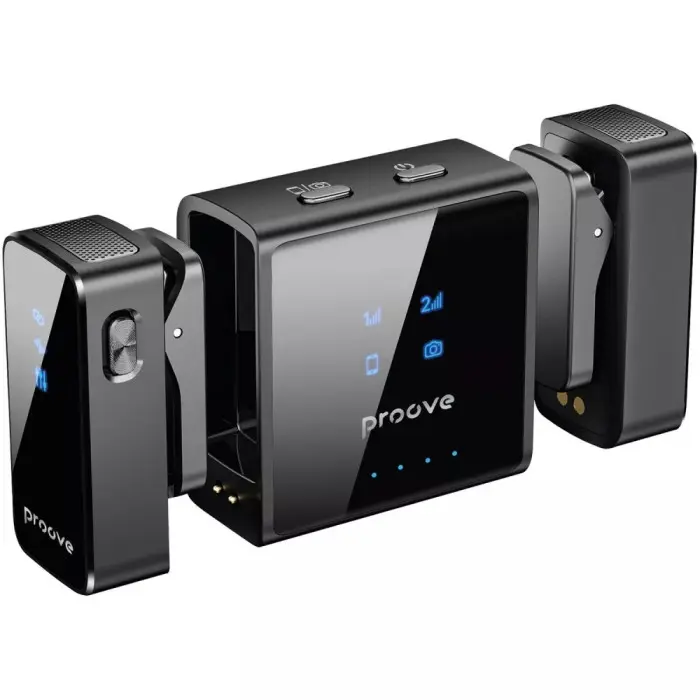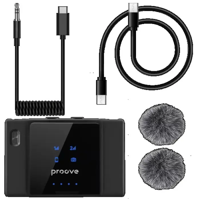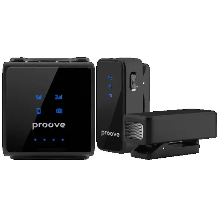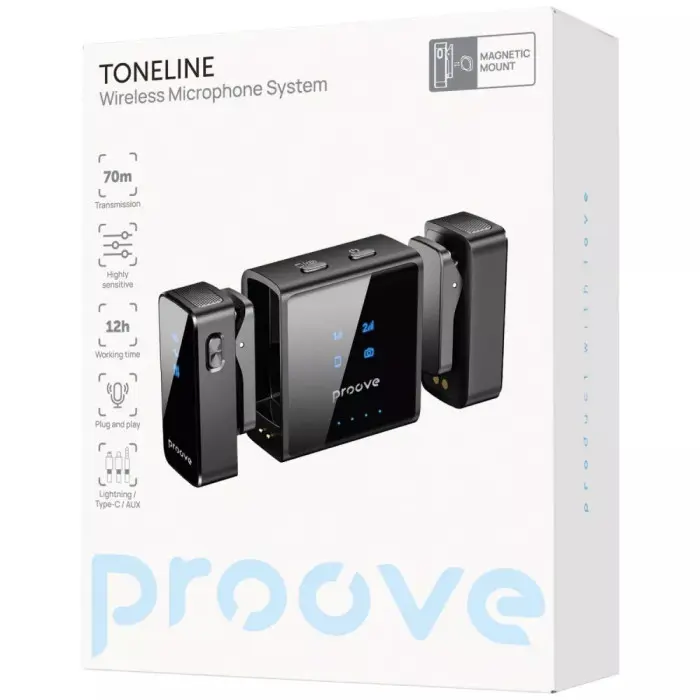 Proove ToneLine має інтуїтивно зрозумілий інтерфейс та просте підключення. Комплект включає все необхідне для швидкого початку роботи — мікрофон, бездротовий передавач і приймач, зарядні кабелі та інструкцію. Завдяки ретельній наладці пристрій швидко встановлюється та готовий до використання.