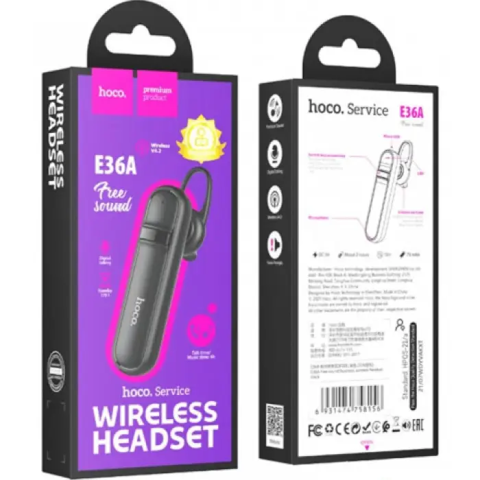 Bluetooth гарнітура Hoco E36A – це бездротовий пристрій, який допомагає вести телефонну розмову, не утримуючи телефон біля вуха. Користується великою популярністю у користувачів, які керують автомобілем, у монтажників та в багатьох інших сферах діяльності. Гарнітура Hoco E36A має невелику вагу і дає можливість завжди бути на зв'язку. Не завдає дискомфорту при тривалій експлуатації.