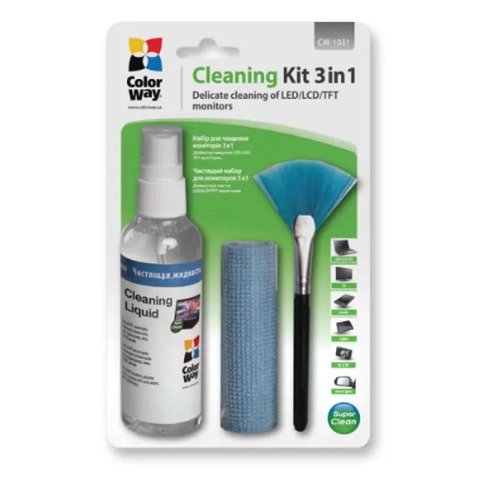 ColorWay CW‑1031 3 в 1 — практичный и универсальный набор для ухода за мониторами и дисплеями. Он безопасен, эффективен и обеспечивает чистоту без царапин и разводов.