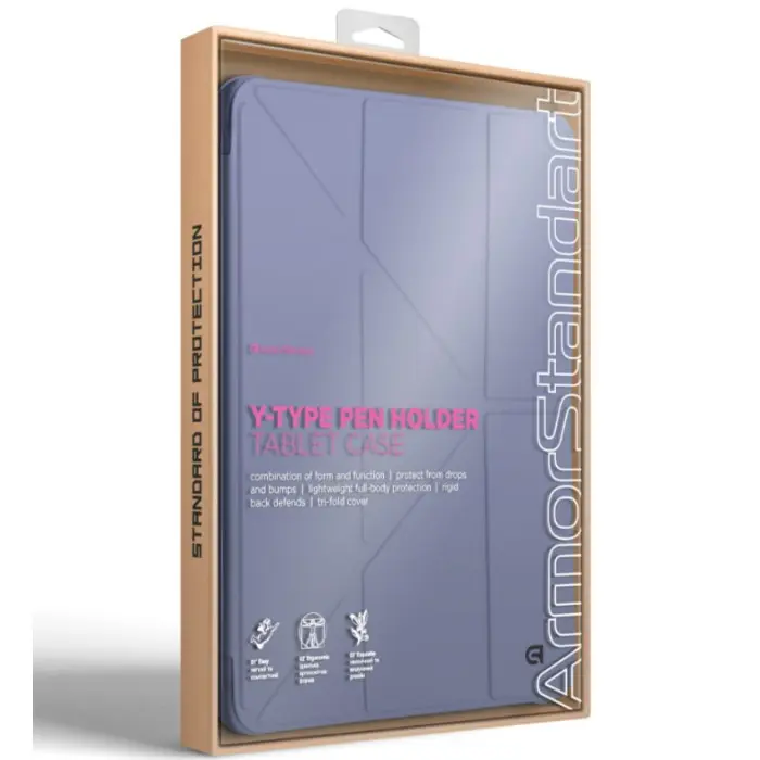Чохол виконаний у витонченому бузковому відтінку, який додає планшету елегантності та сучасного вигляду. Обкладинка виготовлена з преміальної PU-шкіри з матовою текстурою — приємна на дотик, не ковзає і не залишає відбитків пальців. Жорстка задня панель точно фіксує планшет, забезпечуючи міцність і стабільність. Внутрішня підкладка з мікрофібри дбайливо захищає екран від подряпин та потертостей.