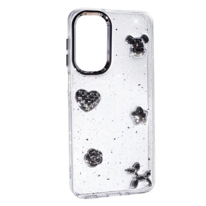 Накладка Glue Case Hit — стильне та яскраве рішення для вашого смартфона. Прозора основа прикрашена об'ємними 3D-декораціями у вигляді вишень, бантиків, сердець та інших чарівних елементів. Мерехтливі блискітки створюють ефект святкового сяйва на світлі. Захисні бортики на камеру та екран забезпечують надійність у щоденному використанні. Ідеально підійде для тих, хто любить поєднання гламуру, креативу та трендового дизайну.