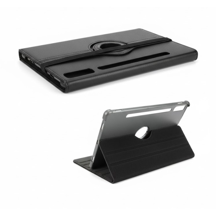 Чохол має строгий чорний дизайн із матовою текстурою, яка приємна на дотик і не залишає відбитків пальців. Задня панель виготовлена із твердого матеріалу, який утримує планшет надійно та запобігає люфтам. Обкладинка має внутрішню підкладку, що захищає екран від подряпин. Формат книжки дозволяє обертання 360° навколо осі, що додає гнучкості у використанні (наприклад, для відео, презентацій, малювання чи читання).