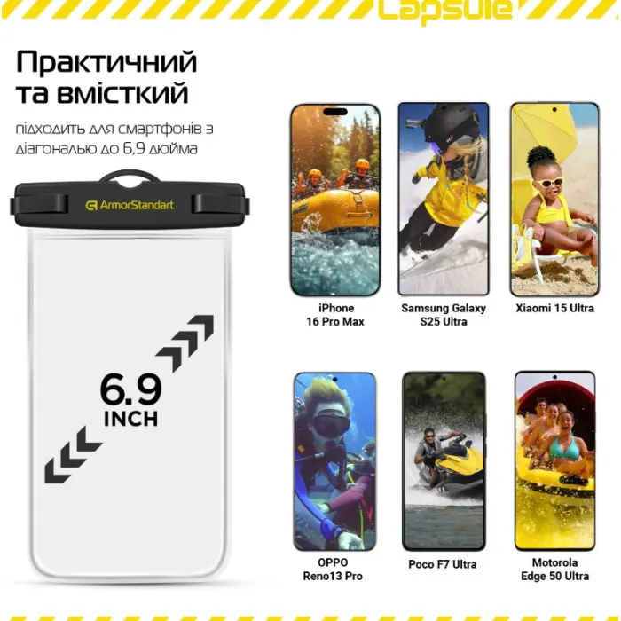 ArmorStandart Capsule підходить не лише для смартфонів, але й для зберігання документів, грошей, банківських карток, ключів або навушників. Його можна брати з собою на пляж, у басейн, у гори, на човен або в дощову погоду.