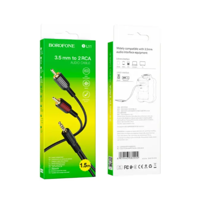 Borofone BL11 – аксесуар для передачі якісного звуку між двома пристроями. Виконання конекторів посилено металевим корпусом. Щільний і гнучкий на дотик матеріал кабелю гарантує збереження обплетення на тривалий час. Довжина кабелю 1,5 м. Встановлення з\'єднання між пристроями здійснюється через 2 RCA (male) – AUX (male).