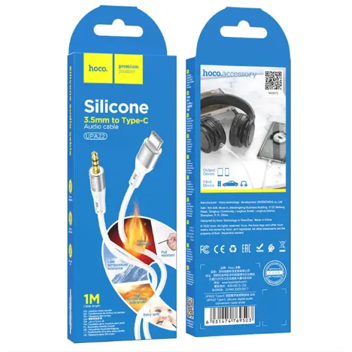 Кабель Hoco UPA22 предназначен для передачи звука из устройств с разъемом Type-C на устройства с разъемом AUX 3,5 мм. Снаружи кабель защищен от разрывов и заломок силиконовым покрытием. Длина: 1м. Разъем: Type-C, mini Jack 3.5mm.