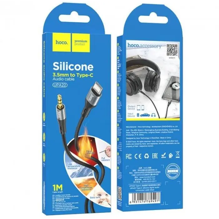 Кабель Hoco UPA22 предназначен для передачи звука из устройств с разъемом Type-C на устройства с разъемом AUX 3,5 мм. Снаружи кабель защищен от разрывов и заломок силиконовым покрытием. Длина: 1м. Разъем: Type-C, mini Jack 3.5mm.