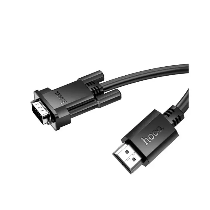 HOCO US12 — надійний кабель з роз’ємами HDTV male to VGA male, який дозволяє підключати настільний комп’ютер, ноутбук або інші пристрої з портом HDMI до дисплея з портом VGA, наприклад, монітора, проектора або телевізора. Виготовлений із якісних матеріалів і покритий стійкою ізоляцією, яка гарантує стабільну передачу сигналу. Кабель має оптимальну довжину, що забезпечить зручну конфігурацію вашого робочого місця. ОСОБЛИВОСТІ • Якісні матеріали (ПВХ). • Надійність. • Довгий термін служби. • Підтримує передачу відео 1080p 60Hz Full HD (не підтримує передачу аудіо). • Роз’єми стійкі до корозії, забезпечують жорсткість та покращують продуктивність сигналу. • ПІідтримує лише передачу HDMI-VGA, а зворотна передача VGA-HDMI не підтримується. • Довжина кабелю — 2 м, вага — 114 г.