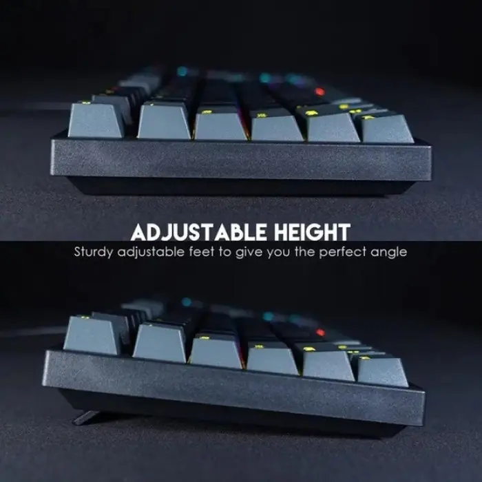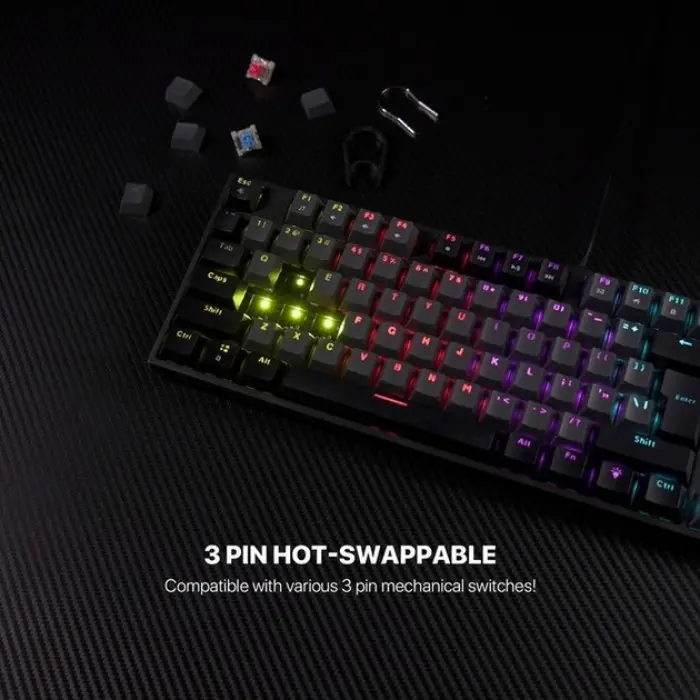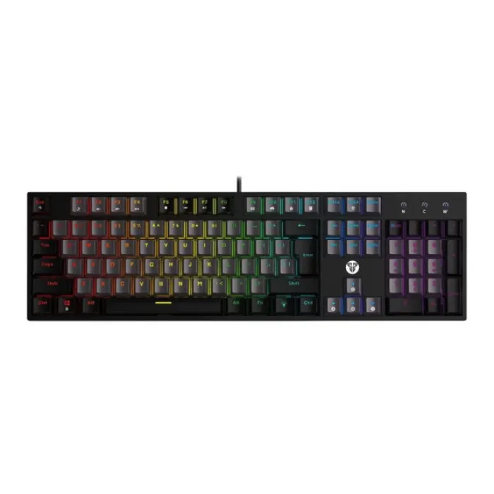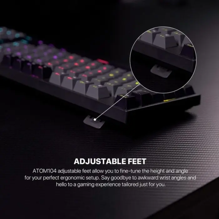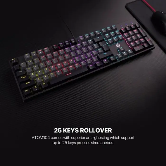 Fantech ATOM MK886V2 - це сучасна ігрова клавіатура механічного типу, створена для геймерів, які цінують якість, надійність і функціональність. Вона допоможе отримати перевагу над супротивниками в ігрових баталіях за рахунок підвищення ефективності та швидкості виконання всіх необхідних дій. Модель привертає увагу триколірними комбінованими клавішами та оригінальним RGB-підсвічуванням, яке може працювати в 10 режимах. Завдяки компактним розмірам (форм-фактор 95%), вона не займе багато місця на столі та збереже простір для вільного пересування миші. Корпус клавіатури надійно зібраний, виготовлений з міцного пластику, доповнений складними підставками і протиковзкими накладками на нижній панелі. Регулятор в її верхньому правому куті призначений для налаштування гучності і підсвічування. Кейкапи всіх її 96 кнопок виконані методом подвійного лиття з пластику двох кольорів, тому символи на них чітко видно, не стираються і не вицвітають. Триконтактні перемикачі клавіатури типу Blue Switch вимагають більшого зусилля для натискання, вирізняються чітким тактильним зворотним зв'язком з характерним клацанням. Підтримка "гарячої заміни" дасть змогу легко і швидко замінити їх на будь-які інші сумісні перемикачі. Швидке виконання навіть найскладніших комбінацій забезпечується функцією Anti Ghosting для всіх клавіш. Для її під'єднання до комп'ютера або іншого пристрою є вбудований кабель із роз'ємом USB (male). Клавіатура комплектується знімачами для перемикачів і кейкапів, додатковими перемикачами та інструкцією.