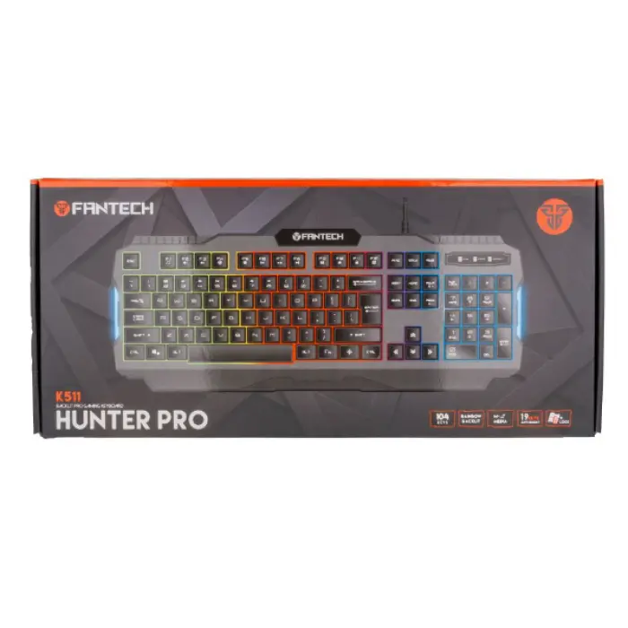 Клавіатура Fantech Hunter Pro K511 - це професійна клавіатура для геймерів, що відрізняється своєю доступною ціною та високою якістю виконання. Модель реалізована в сучасному дизайні, оснащена приємним для очей RGB підсвічуванням, яке надає їй привабливого зовнішнього вигляду, підкреслює її приналежність до ігрових пристроїв і позбавляє необхідності використання додаткового джерела світла. Корпус аксесуара виконаний в оригінальній формі, виготовлений із міцного ABS пластику, а, стійка до зламів, зовнішнє обплетення вбудованого кабелю – з полівінілхлориду. Довжина кабелю – 1.5м. Кейкапи клавіатури виконані з використанням лазерного друку. Ця модель заснована на мембранній технології, завдяки чому ресурс натискань її клавіш становить 8 мільйонів разів. Пристрій оснащений 104 клавішами, включаючи 12 функціональних клавіш для керування мультимедіа. Система запобігання залипанню кнопок дозволяє одночасно затиснути 19 клавіш. Аксесуар сумісний із пристроями під керуванням Windows та MacOS X, які мають USB-роз\'єм.