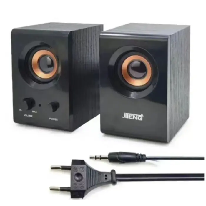 Компьютерные колонки YST-2302(D-99A) - это акустическая система, которая состоит из двух колонок и может подключаться к настольному компьютеру, ноутбуку, ТВ приставке и даже к смартфону или планшету. Несмотря на отсутствие сабвуфера, она воспроизводит качественный звук с насыщенными средними, чистыми высокими и отчетливыми низкими частотами, поэтому отлично подойдет для повседневной эксплуатации во время просмотра фильмов и прослушивания музыки. Корпуса колонок надежно собраны, изготовлены из комбинации пластика и дерева, что значительно снижает возникновение посторонних шумов и усиливает акустический эффект. На одной из колонок находится регулятор громкости, кнопка включения и LED индикатор, который светит синим цветом и поможет контролировать работу устройства. Каждая из колонок снабжена современным широкополосным динамиком мощностью 3Вт. Для их подключения к источникам питания и звука имеются встроенные кабеля: один с сетевой вилкой стандарта EU, а второй - с разъемом AUX типа male (mini-Jack 3.5mm).