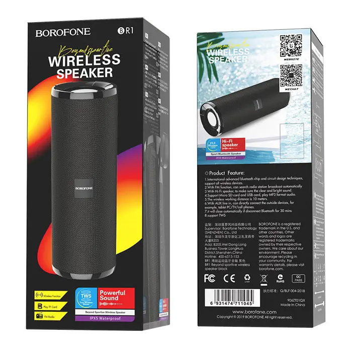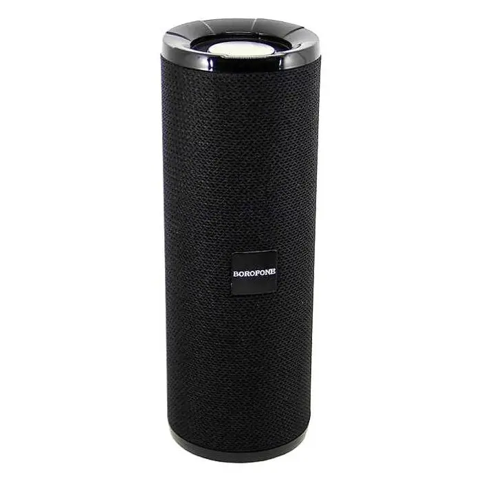 Портативна колонка Borofone BR1 стане чудовим аксесуаром для тих, хто не хоче розлучатися з улюбленою музикою за будь-яких обставин. Вбудований мікрофон дозволяє використовувати пристрій як гарнітуру гучного зв'язку. Корпус пристрою реалізований у зручній циліндричній формі, виконаний у текстильній обшивці та міцного пластику. Вбудований акумулятор забезпечує безперервну роботу колонки протягом 3 годин, його ємність 1200 mAh дозволяє зарядити смартфон та інші гаджети. Заряджання батареї здійснюється від стаціонарної електромережі або комп'ютера через кабель micro-usb, що входить до комплекту. Аксесуар підключається до джерела звуку через Bluetooth v.5.0 або стандартний роз'єм mini jack 3,5 мм. Пристрій оснащений слотом для карт пам'яті, FM приймачем, роз'ємами USB та Micro-USB. Також в комплект входить AUX кабель.
