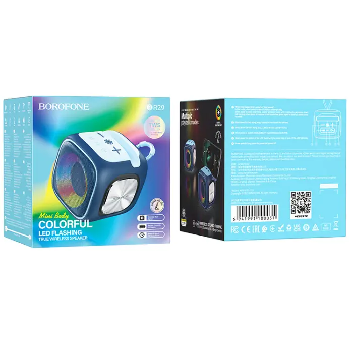 Портативна bluetooth колонка Borofone BR5 передає весь діапазон частот музики, що прослуховується, враховуючи глибокі баси. Тепер музику можна не тільки почути, а й побачити, адже аксесуар оснащений унікально виконаним підсвічуванням. Короткий ремінець робить експлуатацію пристрою комфортнішою. Корпус виготовлений із міцного пластику, який захистить колонку від пошкоджень, деякі елементи виготовлені з якісного силікону. Модель має захист від води, що відповідає стандарту IPX5. Акумулятор ємністю 1200 mAh забезпечує до 2,5 години роботи без підзарядки. До джерела звуку можна підключитися за допомогою bluetooth версії 5.0 або роз'єму AUX, підтримується відтворення з карток пам'яті, usb флешок, а також FM приймач. Модель комплектується кабелями micro-usb та AUX...