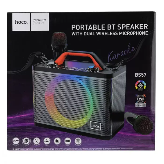 Hoco BS57 Jenny Dual Mic Wireless Karaoke виготовлена з ABS пластику та алюмінію, що поєднуються в одне ціло завдяки сучасній Led-підсвітці. Колонка має прямокутну форму та відносно невеликий розмір, тож не займає багато місця і добре вписується у дизайн квартири.