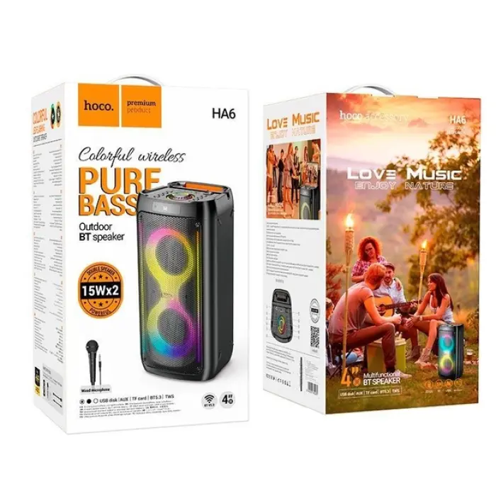 У комплекті входить колонка HOCO HA6, дротовий мікрофон та фірмова упаковка.