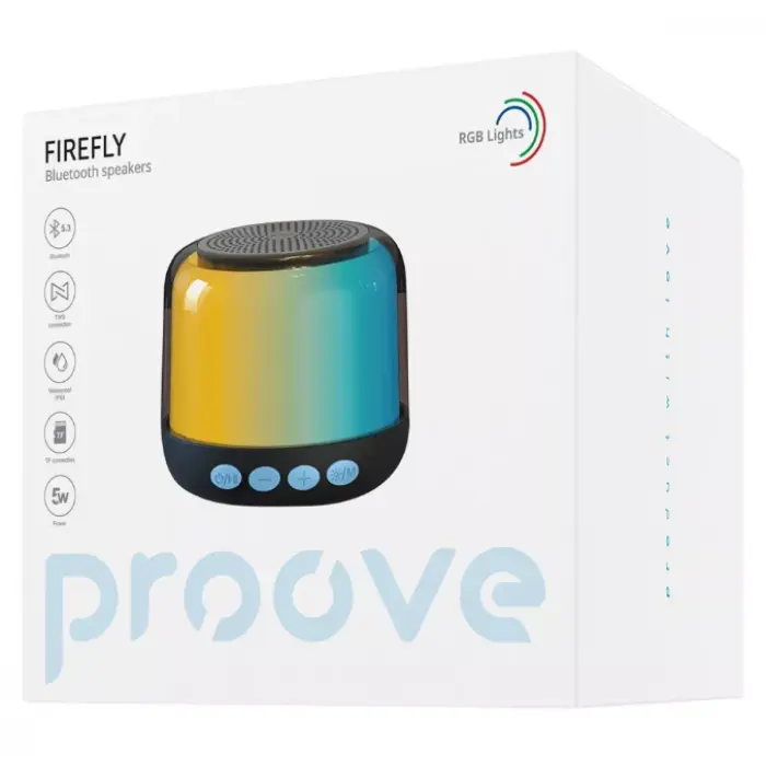 Proove Firefly має компактний розмір та круглу форму, яка зручно лежить у руці. RGB-підсвітка, що оточує колонку, створює яскраву атмосферу та захоплюючу візуальну динаміку.