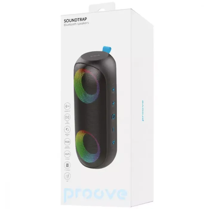 Proove SoundTrap має компактний розмір та зручну форму, що робить її ідеальним супутником для тих, хто хоче насолоджуватися чистим і потужним звуком. Чорний колір, прогумовані підставки та RGB-підсвітка додають їй цікаві родзинки та стильний вигляд.