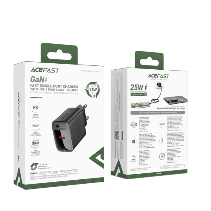 Acefast A104 PD25W GaN (Single USB-C Charger) — це універсальний, надійний і компактний зарядний пристрій, який забезпечує швидке та безпечне заряджання сучасних гаджетів. Завдяки передовій GaN-технології та підтримці PD 25W він стане ідеальним супутником для дому, офісу та подорожей.