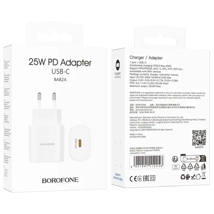 Компактний і функціональний мережевий адаптер Borofone BA82A з одним портом USB‑C забезпечує швидку та ефективну зарядку сучасних гаджетів. Завдяки підтримці технологій Power Delivery (PD) і Quick Charge (QC) пристрій може автоматично адаптувати подачу живлення під вимоги підключеного пристрою з максимальною вихідною потужністю 25 Вт.