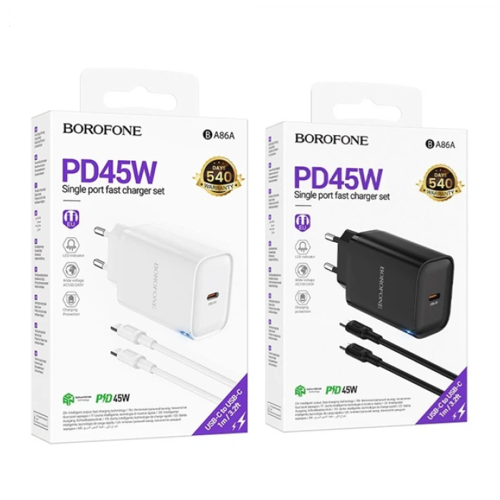 Borofone BA86A 1USB-C PD/QC 45W + Type-C to Type-C — це оптимальне рішення для тих, хто шукає швидке, безпечне й універсальне заряджання у будь-яких умовах.