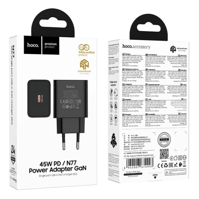 Hoco N77 GaN 45W — це надійний, ефективний і компактний зарядний адаптер із потужністю, достатньою для швидкої та безпечної зарядки ваших гаджетів у будь‑яких умовах.
