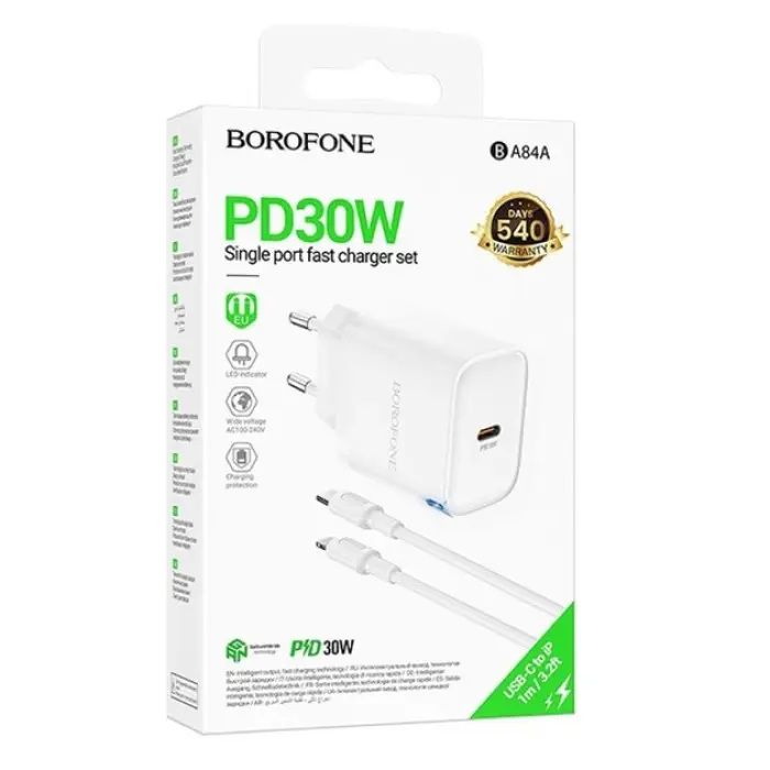 Borofone BA84A — це компактний та потужний мережевий зарядний адаптер з одним портом USB‑C і кабелем Type‑C → Lightning у комплекті. Він створений для ефективної, стабільної та безпечної зарядки сучасних смартфонів, планшетів і інших пристроїв, зокрема Apple.