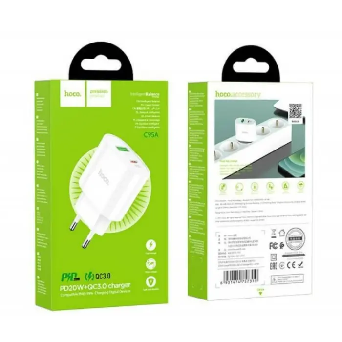 Сетевое зарядное оборудование Hoco C95A Lineal PD20W+QC3.0 позволит быстро зарядить практически любой планшет или смартфон. Модель отличается высоким качеством исполнения, совместимостью с большинством моделей смартфонов, имеет компактные размеры и небольшой вес. Корпус устройства реализован в удобной, практичной форме, имеет скругленные боковые грани и приятную на ощупь глянцевую поверхность, изготовленную из надежной комбинации ABS пластика и огнестойкого поликарбоната. Торец адаптера, в котором находятся все разъемы, выполнен со слегка приподнятыми кромками и рельефной поверхностью с текстурой переплетения карбонового волокна. Модель оснащена двумя разными разъемами: Type-C и USB. Быстрая зарядка совместимых гаджетов возможна благодаря поддержке PD20W, QC3.0/QC2.0, AFC, PPS и других протоколов. Мощность на выходе разъема Type-C может достигать 20Вт, на выходе USB-разъема – 18Вт, общая максимальная сила тока на выходе разъемов составляет 3А.